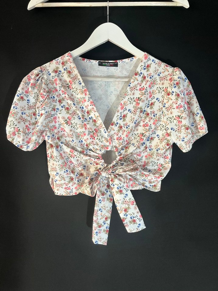 Hafif beyaz kumaştan, kısa kollu, V yakalı, bol kesim çiçek desenli bohem tarzda, düğmeli ve bağcıklı kısa bluz.
