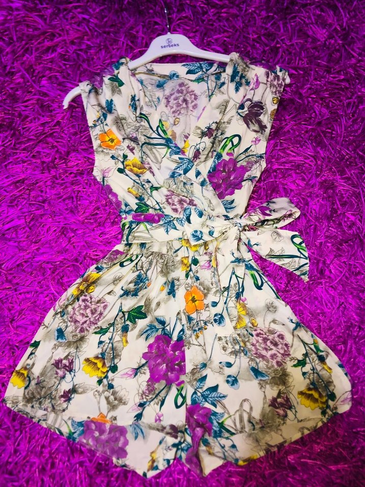 Renkli çiçek desenli, v yaka, kolsuz, dantel detaylı, bohem tarzda kısa tulum. Parti için uygun şık tasarım.