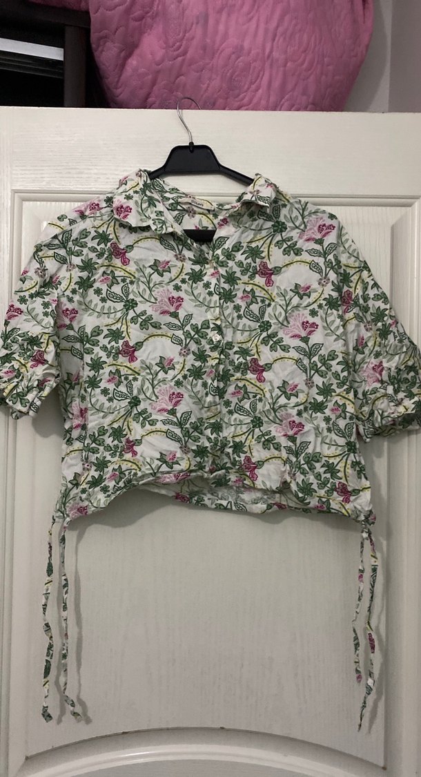 Çiçek desenli, kısa kollu, düğmeli ve halter yakalı bohem tarzda rahat kesim kız bluzu.