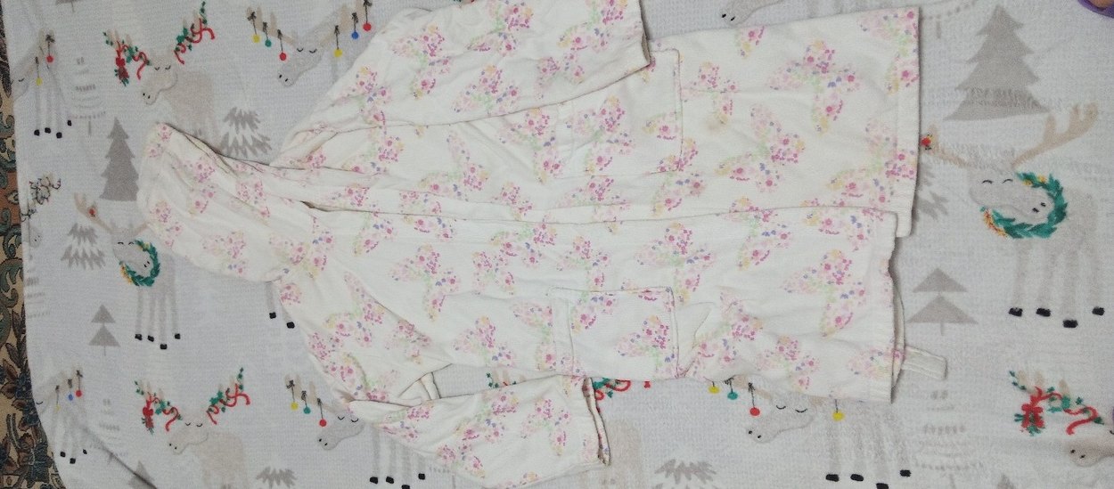 Sentetik kumaştan yapılmış, Kuşaklı, bol kesim, çiçek desenli ve bohem tarzda kız bornozu. Notlu yaka detayı bulunur. lekeler vardır ama çıkabilir