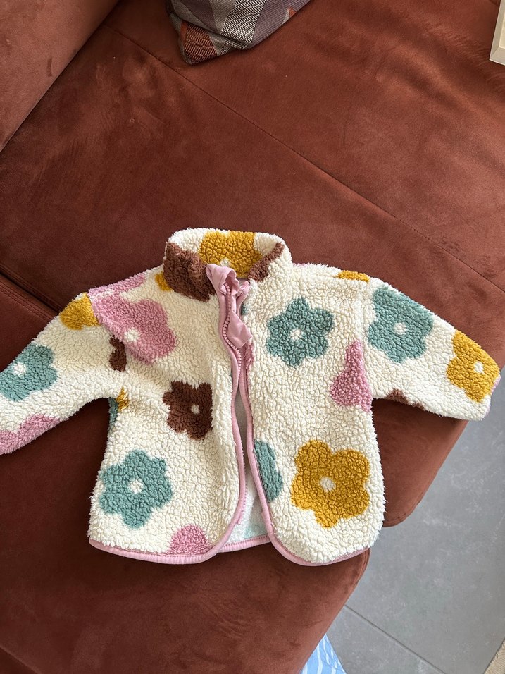Yüksek yakalı, bol kesim kız çocuk ceketi, yumuşak örme dokuda. Pastel çok renkli çiçek desenli, bohem tarzda. Temiz. Hepsi için fiyattır