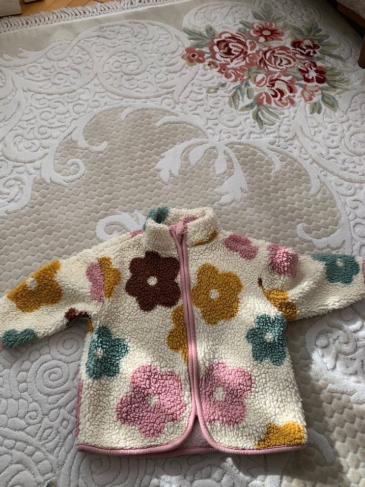 Yumuşak, örme yünlü kumaştan yapılmış, çiçek desenli, bohem tarzda, fitted kesim kız çocuk ceketi, bisiklet yaka ile.