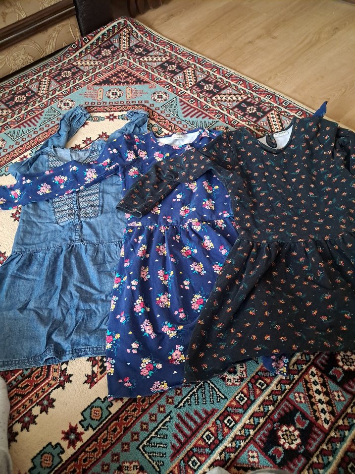 Bohem tarzda, straplez yaka ve fırfır detaylı, bol kesim kız elbisesi. Koyu renkli, çok renkli desenli ve kısa kolludur.