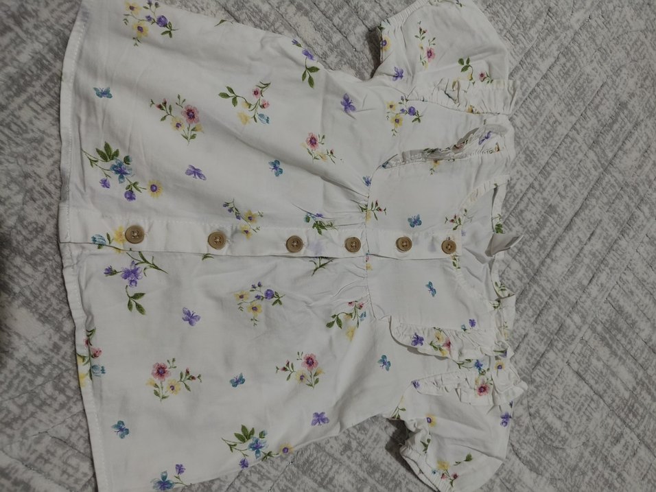 Düğmeli, V yakalı, kısa kollu, hafif renkli çiçek desenli, sentetik kumaştan bol kesim kız elbisesi.