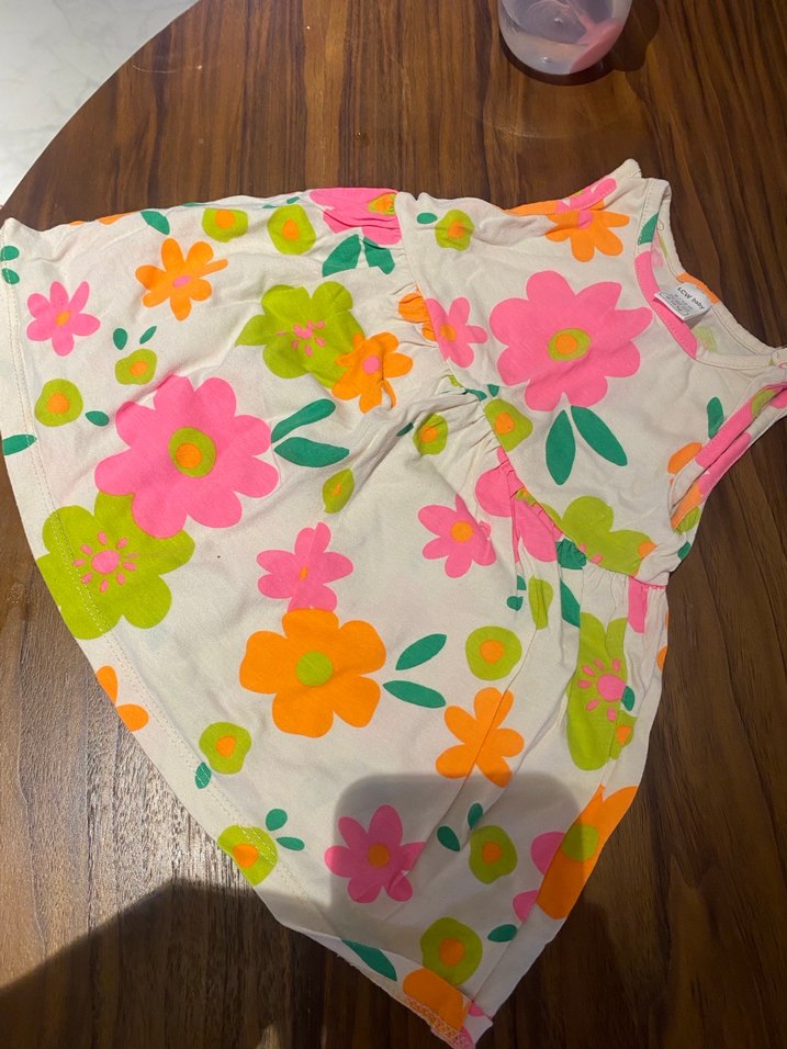 Çiçek desenli, pastel renklerde, kolsuz, bol kesim ve fırfır detaylı kız elbisesi, yumuşak sentetik kumaştan.
