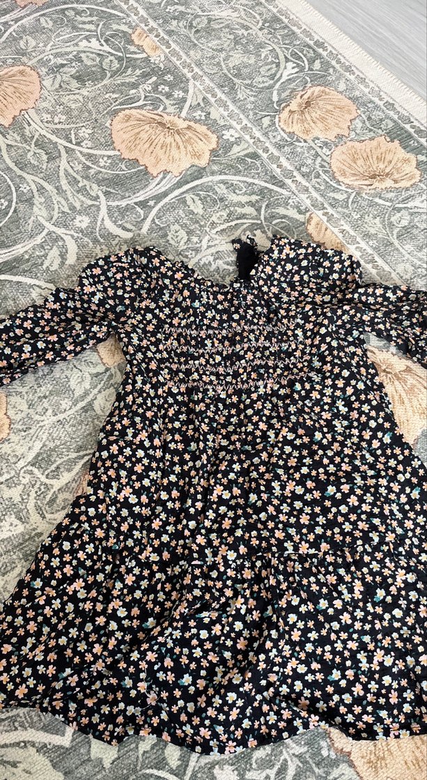 Uzun kollu, V yakalı ve nakışlı çiçek desenli kız elbisesi. Bol kesim ve fırfır detaylı, koyu renkli çok renkli bohem tarzda.