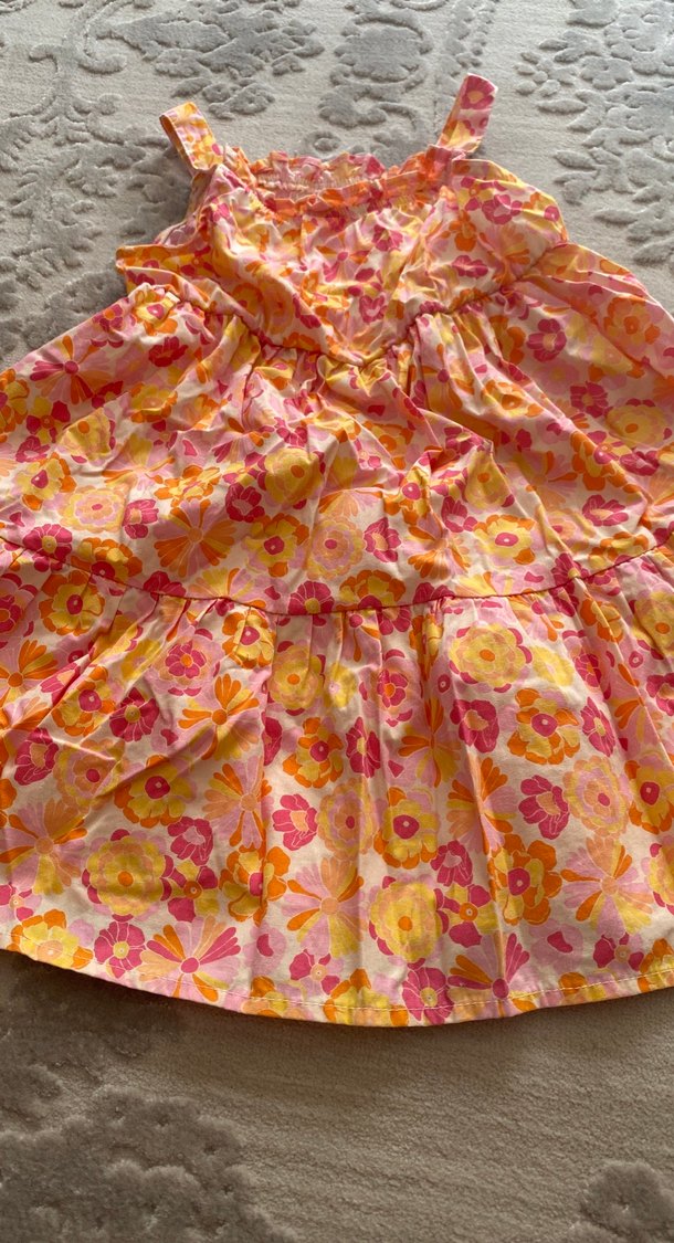 Sentetik kumaştan, pastel çiçek desenli, volanlı ve askılı kayık yaka bohem tarzda bol kesim kız elbisesi.