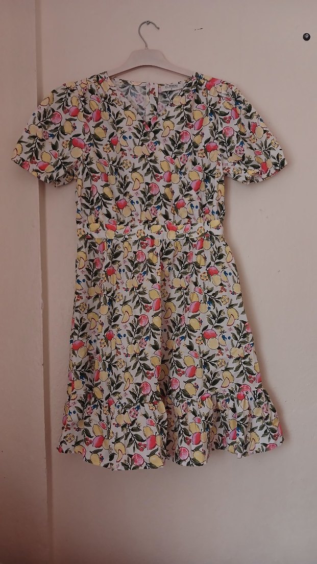 Çiçek desenli, V yakalı ve kısa kollu, bol kesim bohem kız elbisesi. Pastel çok renkli ve fırfır detaylı, yumuşak sentetik kumaştan.