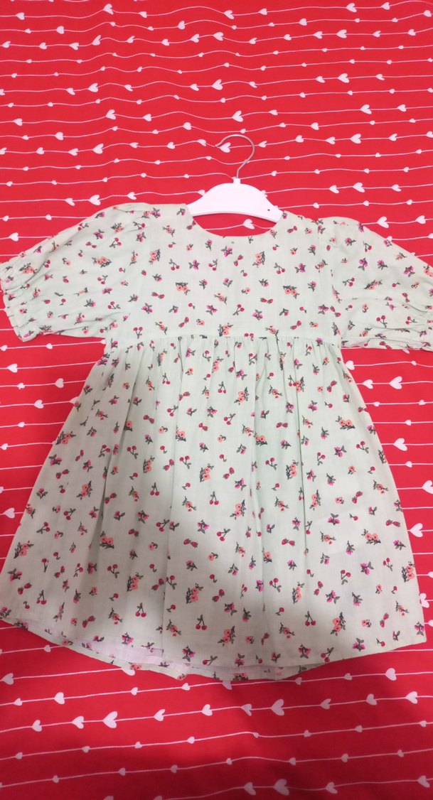 Kızlar için bol kesim, kısa kollu, V yakalı elbise. Pastel çiçek desenli ve fırfırlı, bohem tarzda, yumuşak sentetik kumaştan.