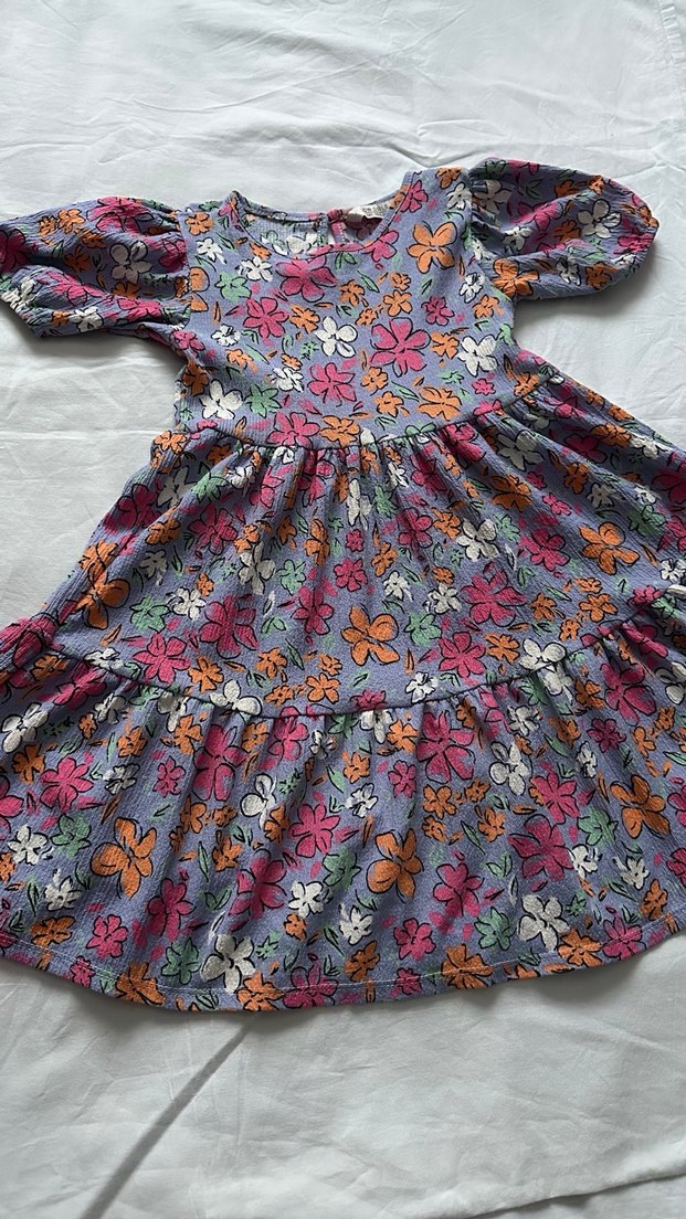 Renkli çiçek desenli, bol kesim bohem kız elbisesi. Fırfır detaylı ve yuvarlak yakalı, yumuşak sentetik kumaştan.