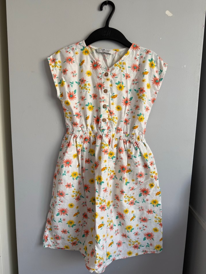 Bu kolsuz kız elbisesi, beyaz zemin üzerinde renkli çiçek desenine sahiptir. V-yaka, düğmeli ön ve bol kesimli