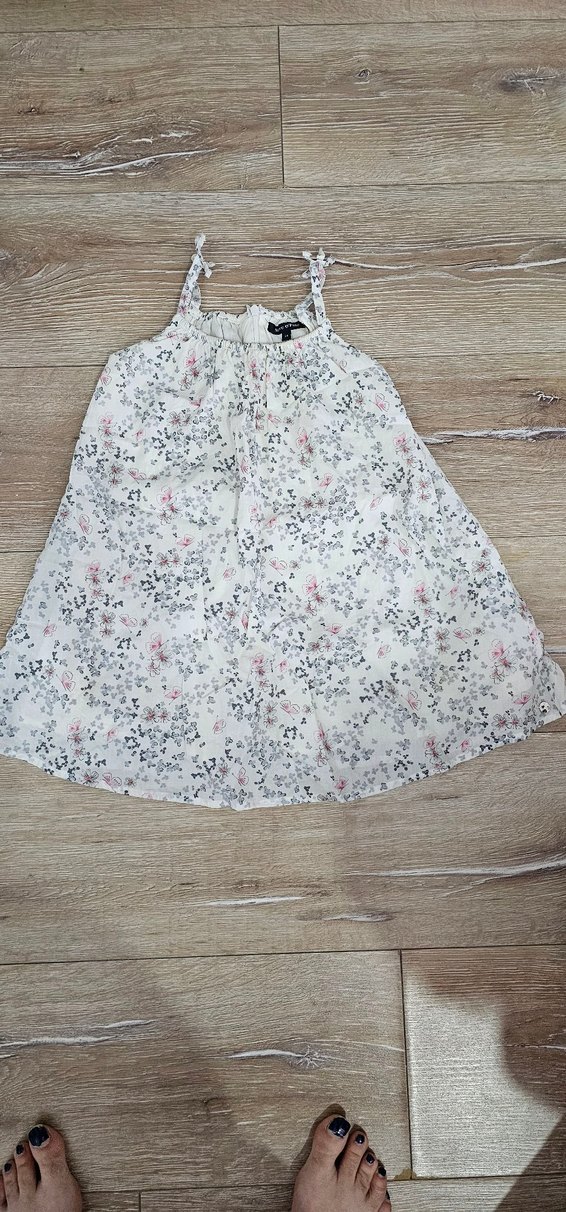 Kolsuz, straplez yakalı ve bol kesim kız elbisesi. yumuşak kumaştan, gri beyaz çiçek desenli ve fırfırlı bohem tarzda.
