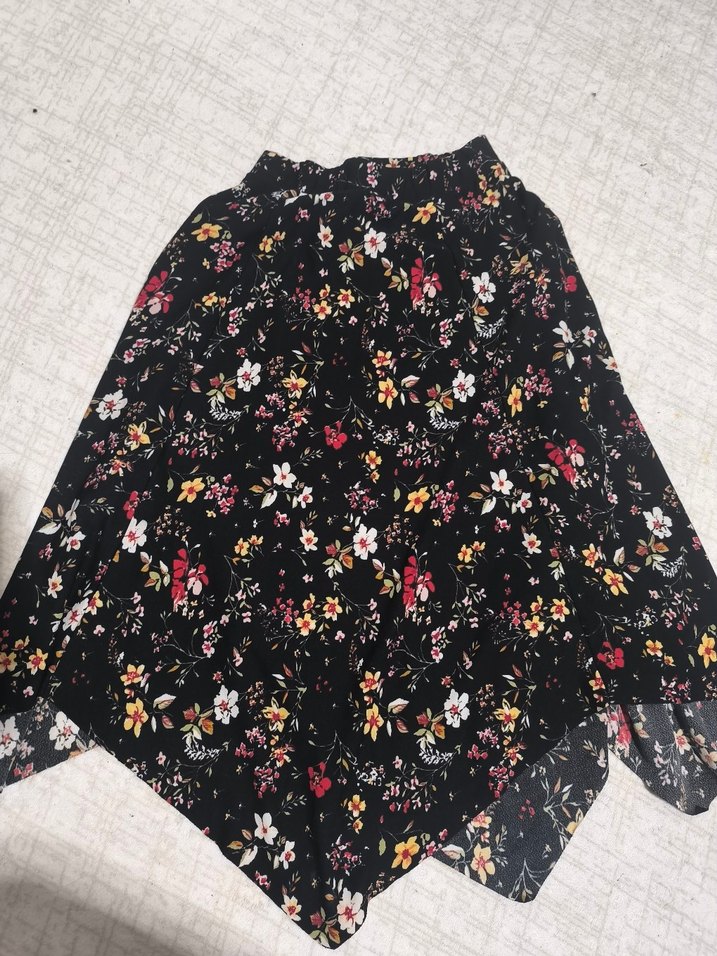 Sentetik kumaştan yapılmış, koyu renkli çoklu çiçek desenli, bol kesim ve fırfırlı bohem tarzda kız eteği.