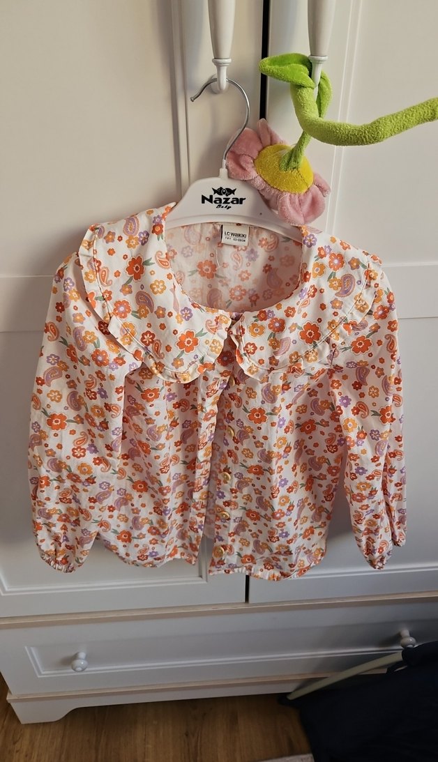 Pamuklu, bol kesim, uzun kollu kız gömleği, yakalı ve düğmeli, pastel renkli çiçek desenli.