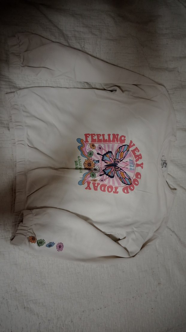 Bol kesim, uzun kollu kız sweatshirtü, yuvarlak yaka ve pastel çok renkli kelebek ve çiçek baskısına sahip. "FEELING VERY GOOD TODAY" yazılı, yumuşak ve sıcak kumaştan, düğme detaylı.