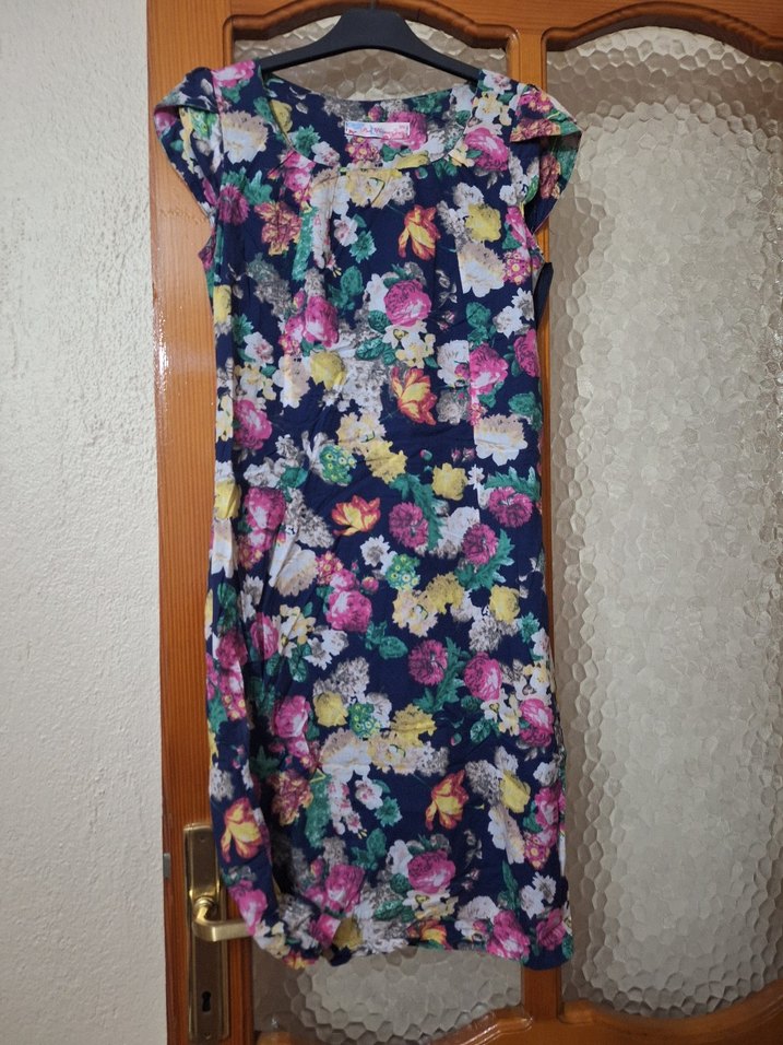 Sentetik kumaştan, v yaka ve kısa kollu, rahat kesimli bohem stil midi elbise. Koyu renkli çok renkli çiçek desenli ve drapeli vintage görünüm sunar.