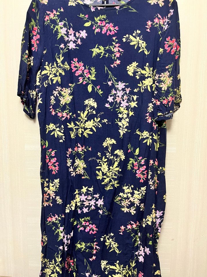 Kısa kollu, yuvarlak yakalı ve bol kesimli midi elbise, koyu zemin üzerinde çiçek desenli. Drapeli tasarımı ve sentetik kumaşıyla bohem tarzına uygun. Yalnızca bir kez giyildi salaş tarzda günlük bir elbise