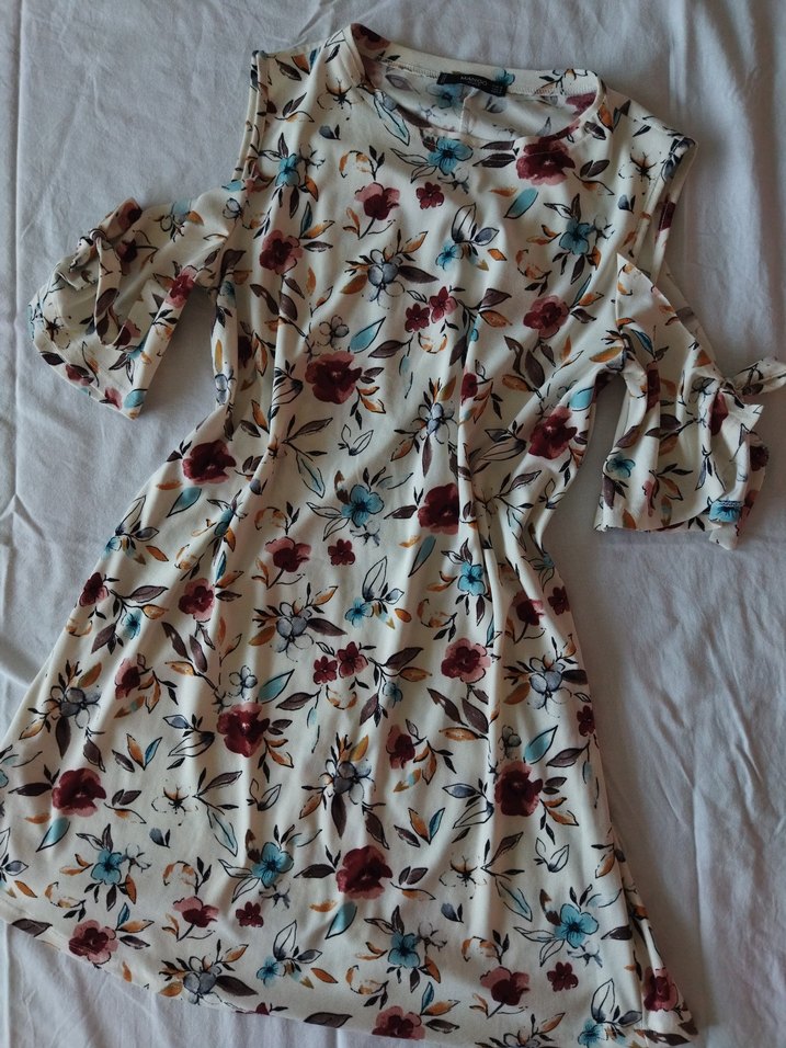 Çiçek desenli, omuzları açık ve bol kesim mini elbise. Mango/M beden