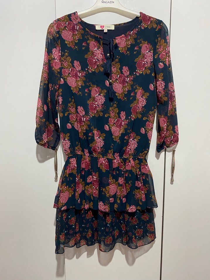 Bohem tarzda, koyu renkli çiçek desenli midi elbise. Fırfırlı, yüksek yakalı, salaş kesim ve ip askılıdır. Sentetik yumuşak kumaştan, romantik akşamlar için uygundur.