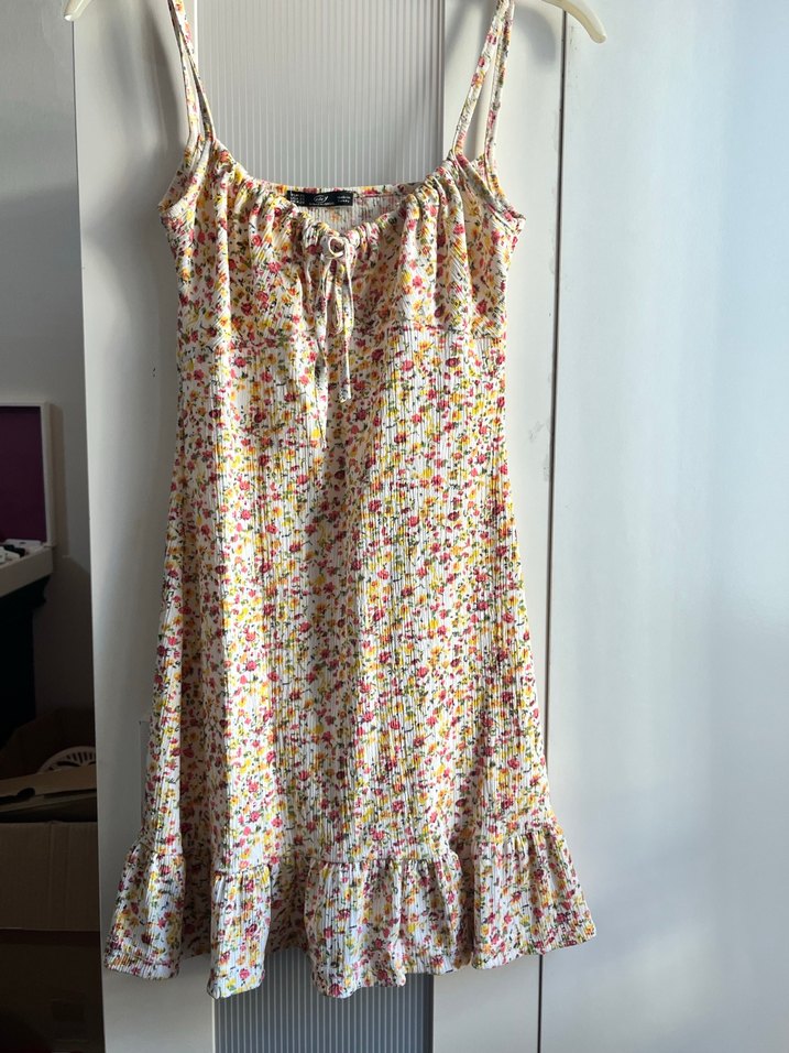 Rahat kesim, ince askılı midi elbise, etek ucu fırfırlı, pastel çiçek desenli yumuşak sentetik kumaş. Günlük kullanıma uygun.