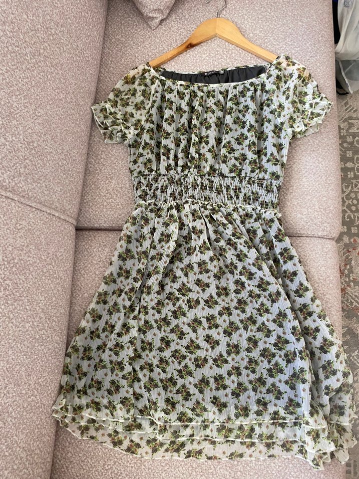Rahat kesim, kısa kollu, volanlı ve çiçek desenli bohem midi elbise, yumuşak sentetik kumaştan, günlük kullanım için uygundur.