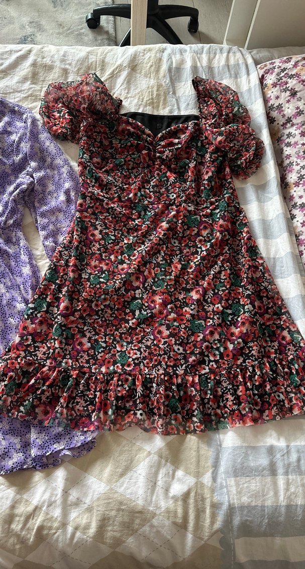 Bu oturan kesim bohem midi elbise, birisi kısa kollu ve öpücük yaka digerinizun kollu v yaka yaka detaylıdır. Koyu renkli çok renkli çiçek desenine ve fırfır süslemelere sahiptir. Yumuşak sentetik kumaştan üretilmiştir, parti için uygundur. İkisi de aynı bedende yazlık giy çık hiç bir kusuru yok kilo aldım