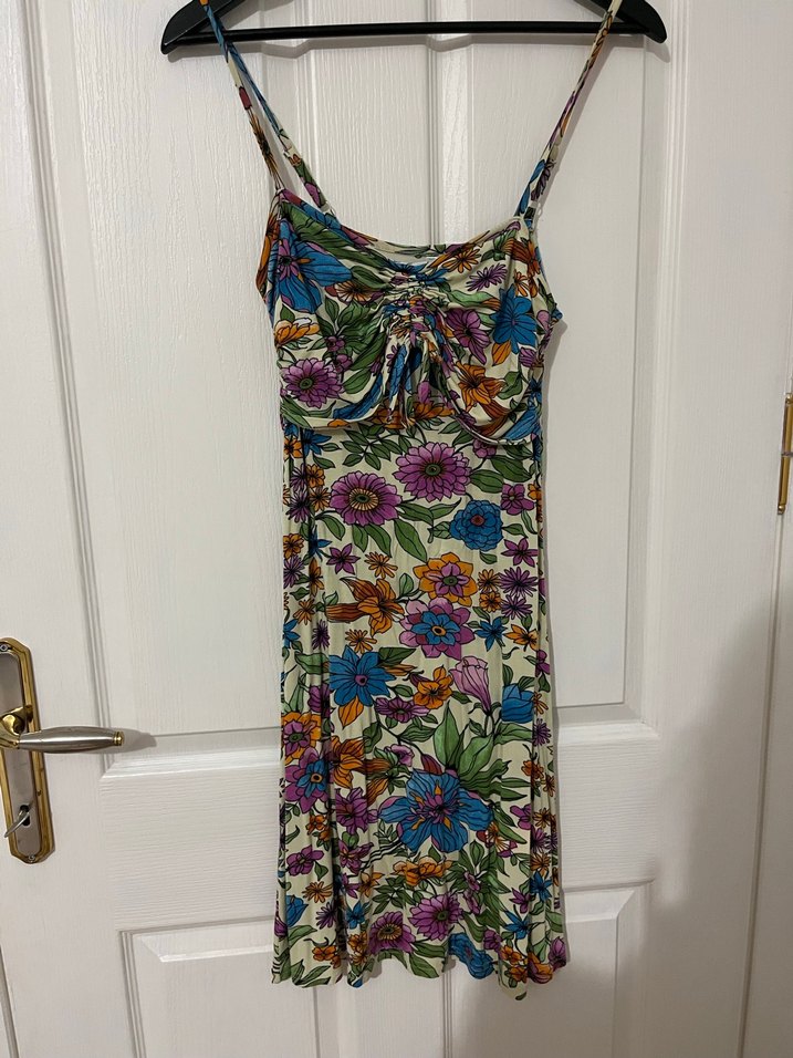 Askılı, straplez yakalı ve drapeli ön detaylı çiçek desenli bohem midi elbise. Yumuşak sentetik kumaştan, günlük kullanıma uygun.