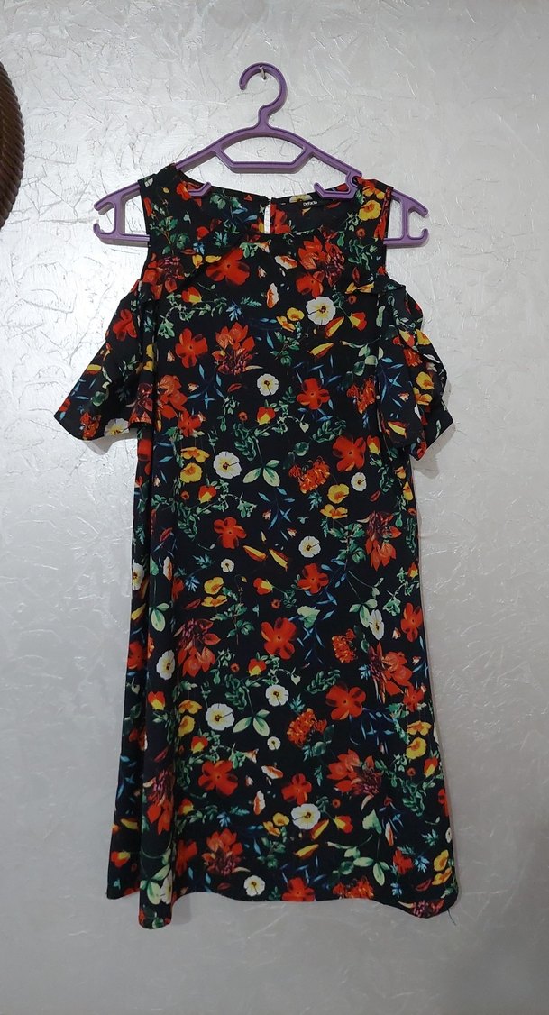 Renkli çiçek desenli, kısa kollu, 1 kere giyilmiş elbise.