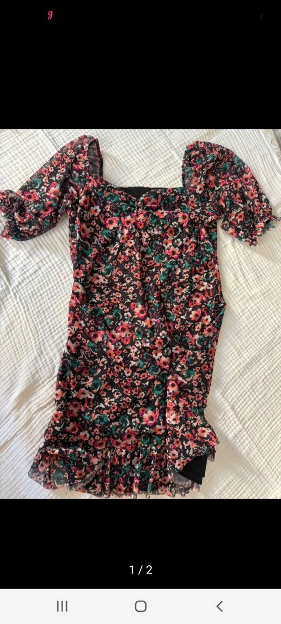 Dar kesim midi elbise, tekne yaka, kısa kabarık kollu ve fırfır detaylıdır. Sentetik kumaştan üretilmiş, koyu çok renkli çiçek deseniyle romantik akşamlar için uygundur.