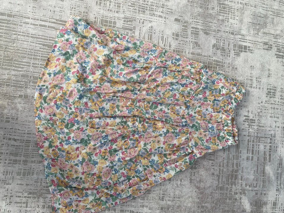 Yumuşak kumaştan, bol kesim ve pastel çiçek desenleriyle, fırfır detaylı midi etek.