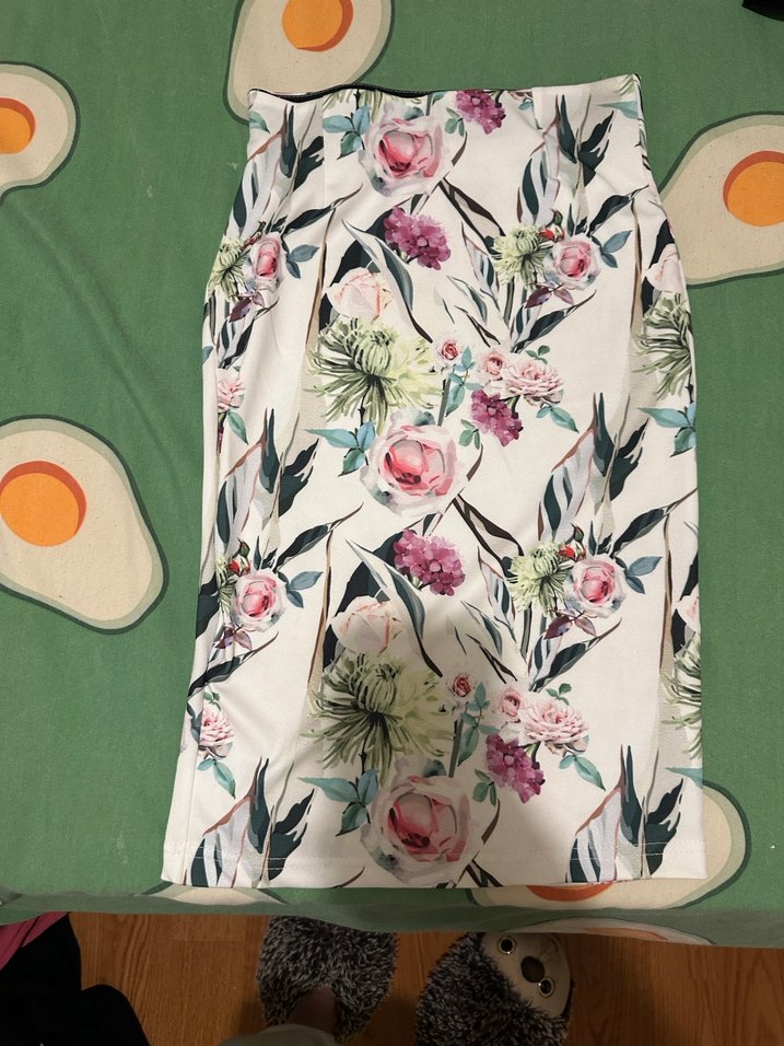 Yumuşak sentetik kumaştan, canlı çiçek desenli, bohem tarzda, günlük kullanıma uygun kalem midi etek.