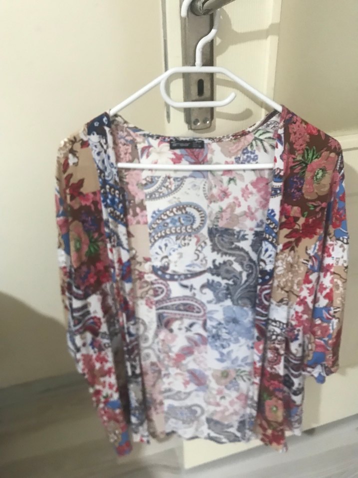 Renkli baskılı, uzun kollu, V yaka, bol kesim ve dökümlü midi uzunlukta hafif kumaştan bohem kimono.resimlerde mevcut duruşu var