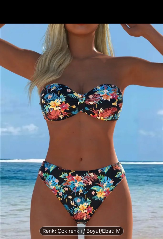 Bu sıkı kesim, askılı bikini koyu renkli çiçek desenleriyle plaj için uygundur. Bohem tarzı ve canlı renkleriyle dikkat çeker.