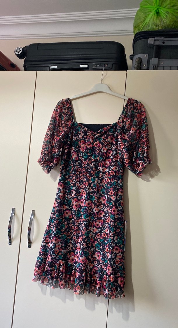 Çok renkli çiçek desenli, kısa balon kollu ve fırfır detaylı bohem tarzı, tekne yakalı mini elbise.