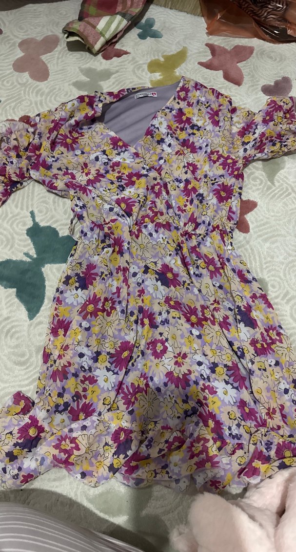 Rahat kesimli, pastel çiçek desenli mini elbise. Volan detaylı, V yakalı ve askılı kollu, bohem tarzda günlük kullanıma uygun.