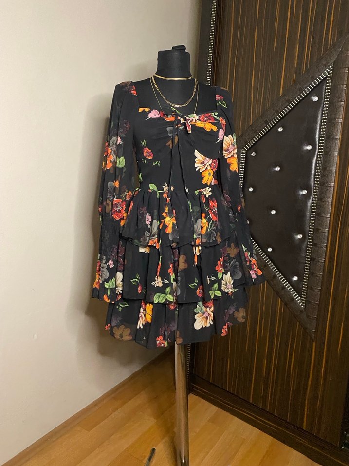 Karanlık çok renkli bu mini elbise, bol kesim, fırfır detaylar, halter yaka ve askılı kollara sahiptir, romantik akşamlar için uygundur.