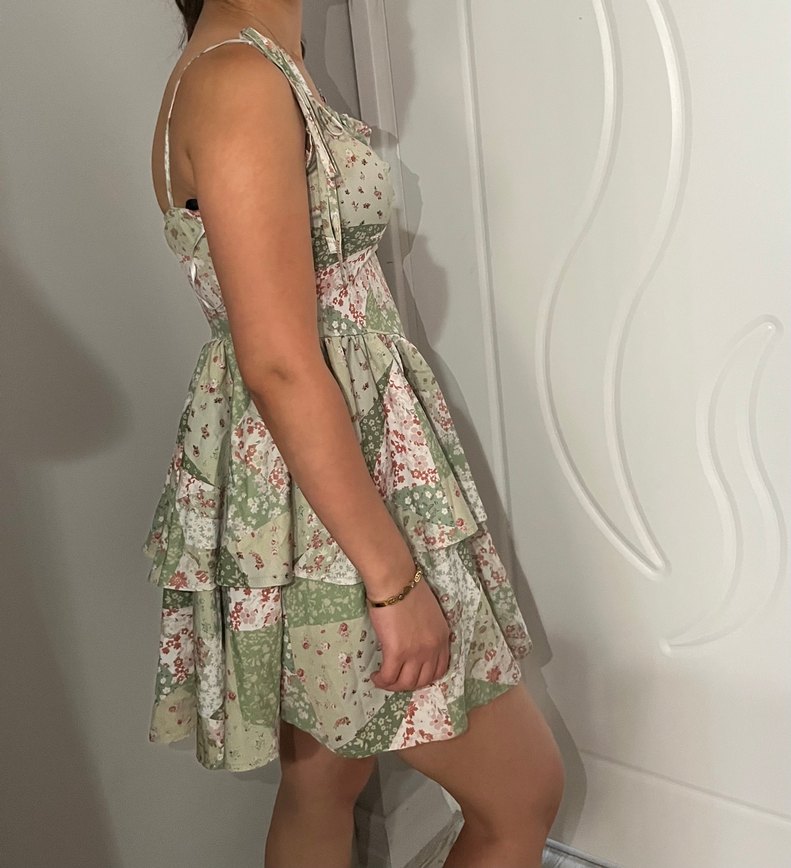 İnce askılı, straplez yaka ve fırfırlı katmanlara sahip, fitted kesim bohem mini elbise. Yumuşak sentetik kumaştan, pastel çiçek desenli, günlük kullanıma uygun.