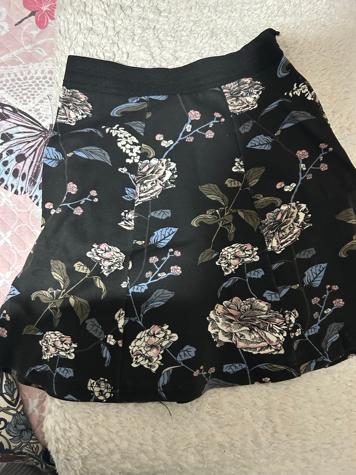 Bu bohem tarz mini etek, gevşek kesim ve fırfır detaylarıyla, sentetik kumaş üzerinde koyu renk çiçek desenine sahiptir, günlük kullanım için uygundur.