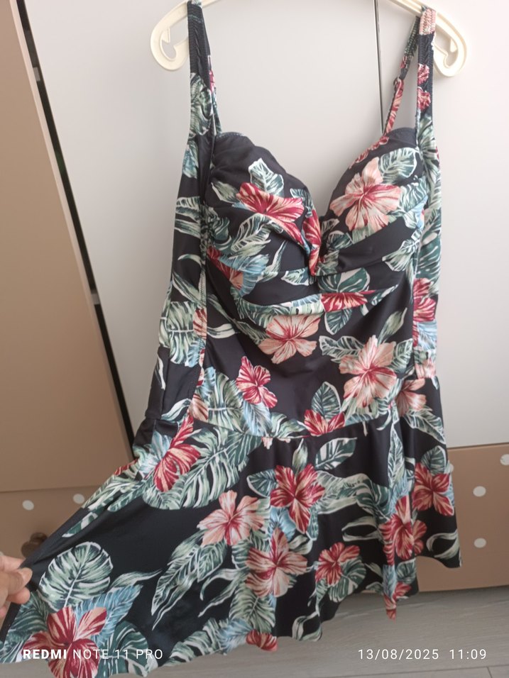 Kolsuz, bol kesim ve drapeli tasarıma sahip, koyu zemin üzerinde canlı çiçek desenli kadın mayo. Bohem tarzda, plaj için uygun.