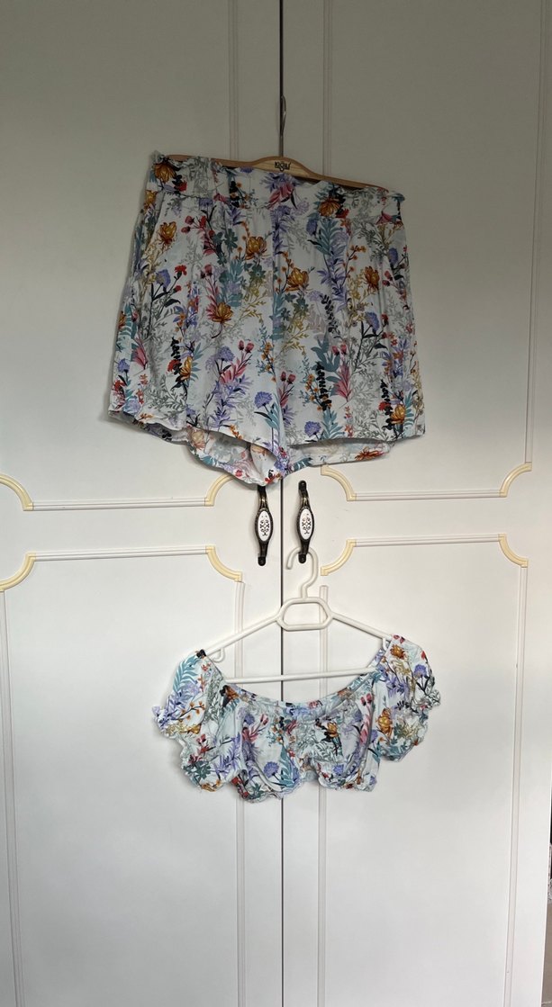 Çiçek desenli, bol kesim ve pile detaylı hafif renkli bohem tarzı hamile şortu, günlük kullanım için uygundur.