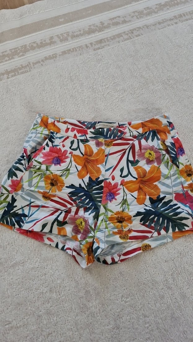 Canlı çiçek desenli, bol kesim kadın mini şort. Yumuşak sentetik kumaştan, fermuarlı kapamalı, açık hava kullanımı için uygun.