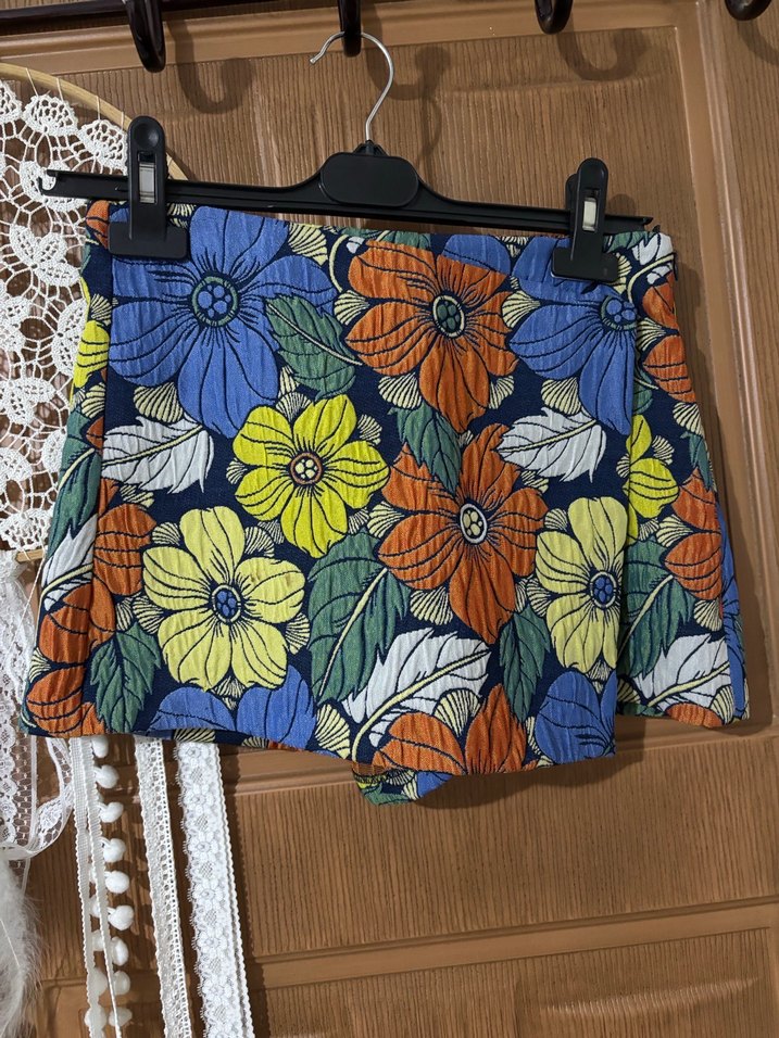 Çiçek desenli, mini şort etek. Koyu çok renkli tasarımıyla bohem tarzı yansıtır.