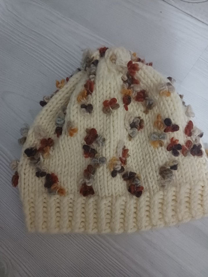 Beyaz örgü kadın bere, küçük renkli çiçek detaylarıyla bohem ve retro tarzını yansıtan rahat bir dokunuşa sahiptir. fiyat 200