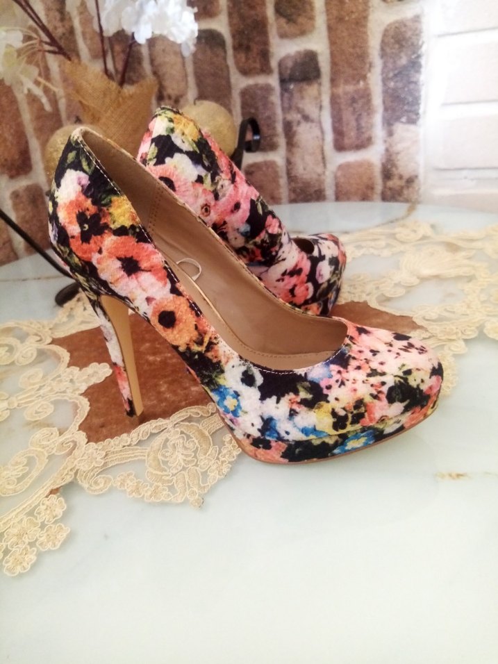 Canlı çiçek desenli ve dantel detaylı renkli platform topuklu stiletto, romantik akşamlar için bohem tarzda. Bir defa giyildi sıfırdan farksız. Yurt dışı ürünü