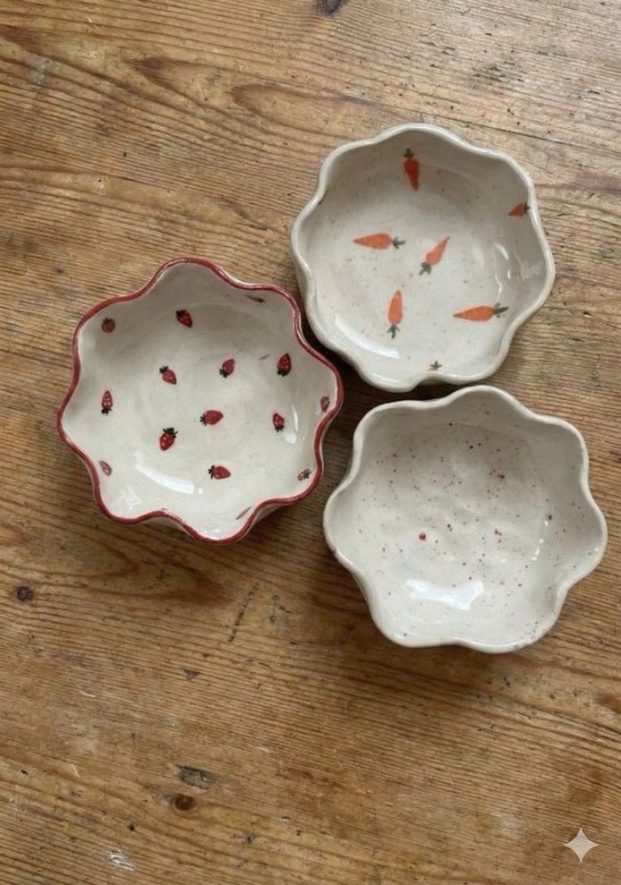 Adet fiyatıdır sipariş üzerine üretilir. Beyaz seramik kaseler, bohem tarzda hafif çiçek desenleri içerir. Çilek ve turuncu havuç desenli, kıvrımlı kenarlı farklı tasarımlar sunar. ️