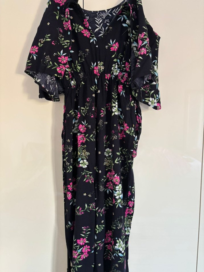 Bol kesim, drapeli hamile tulumu, straplez ve askılı kollara sahip. Koyu renkli, çok renkli çiçek desenlidir ve yumuşak sentetik kumaştandır. kol altı genişlik 40 lastikli bel 28 boy 123