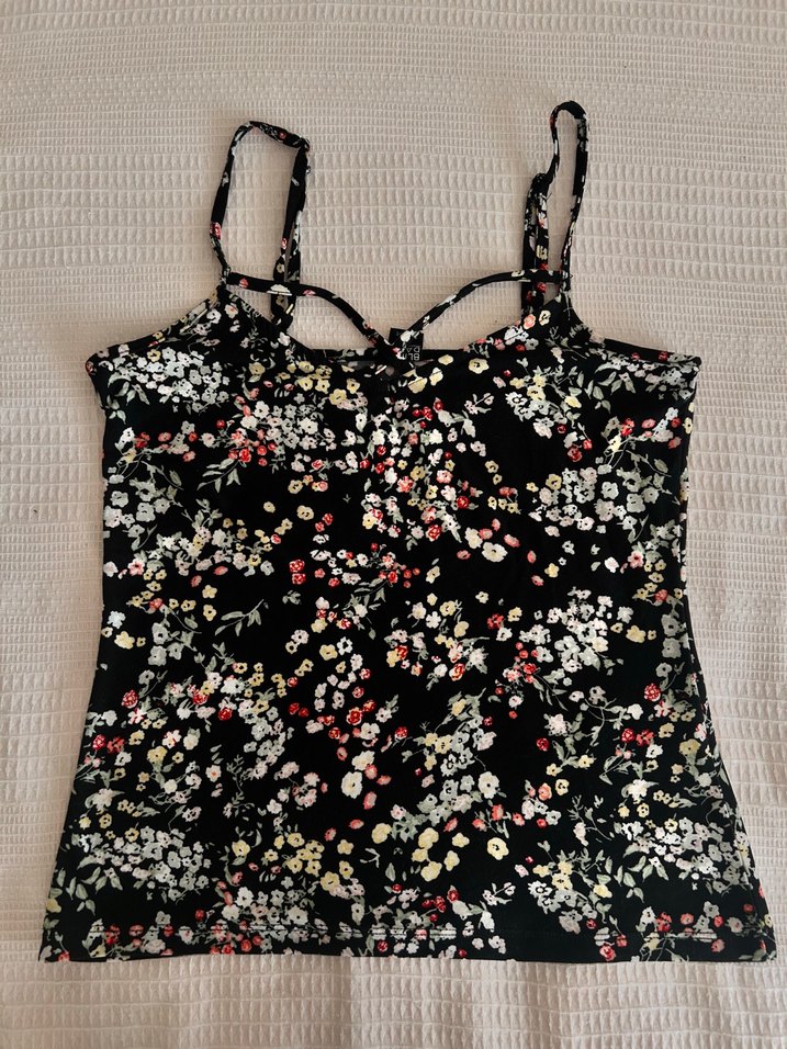 Koyu renkli çok renkli çiçek desenli, askılı ve düğmeli detaylı, bohem tarzda, normal midi boyda oturan bustier.