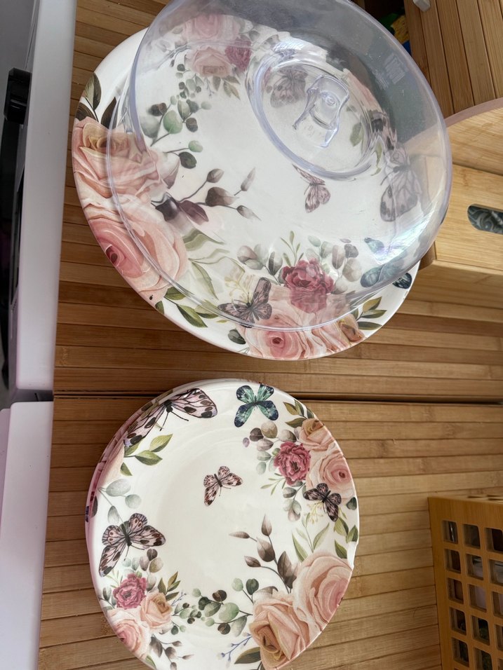Gül ve kelebek desenli, çok renkli hafif çiçekli bohem tarzı tabak seti. Servis için tabak ve uyumlu kapaktan oluşur. Makinaya atılabilir