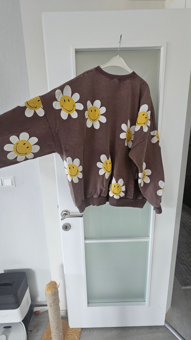 Çiçek desenli, bol kesim, uzun kollu kız sweatshirtü. Yumuşak kumaştan, düğmeli ve bohem tarzda sokak giyimi için uygun.