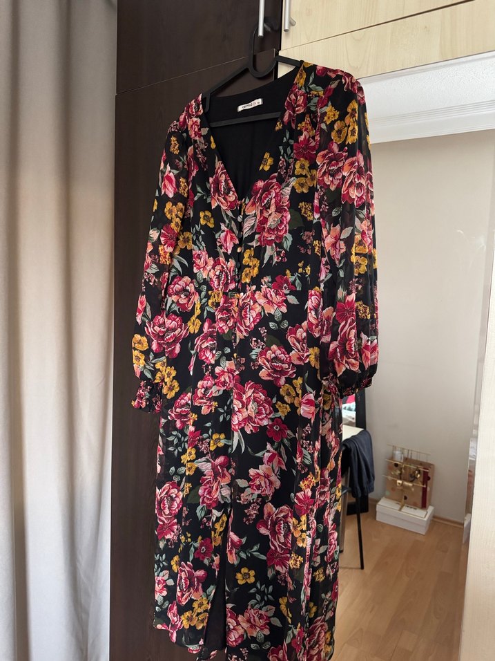 Çiçek desenli, koyu renk sentetik kumaştan uzun ve bol kesim elbise. Uzun kollu, V yaka ve düğmeli detaylara sahip, bohem tarzında.